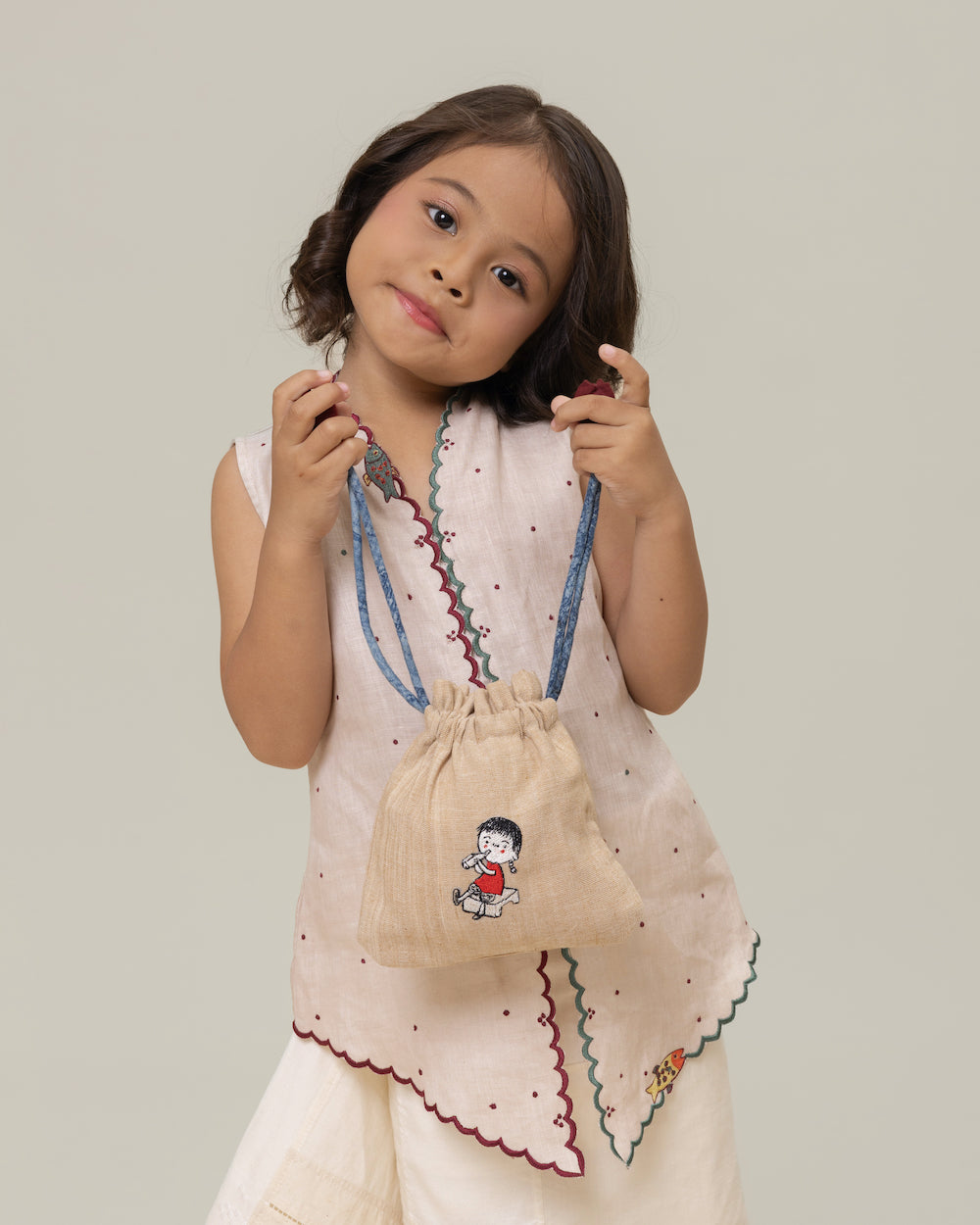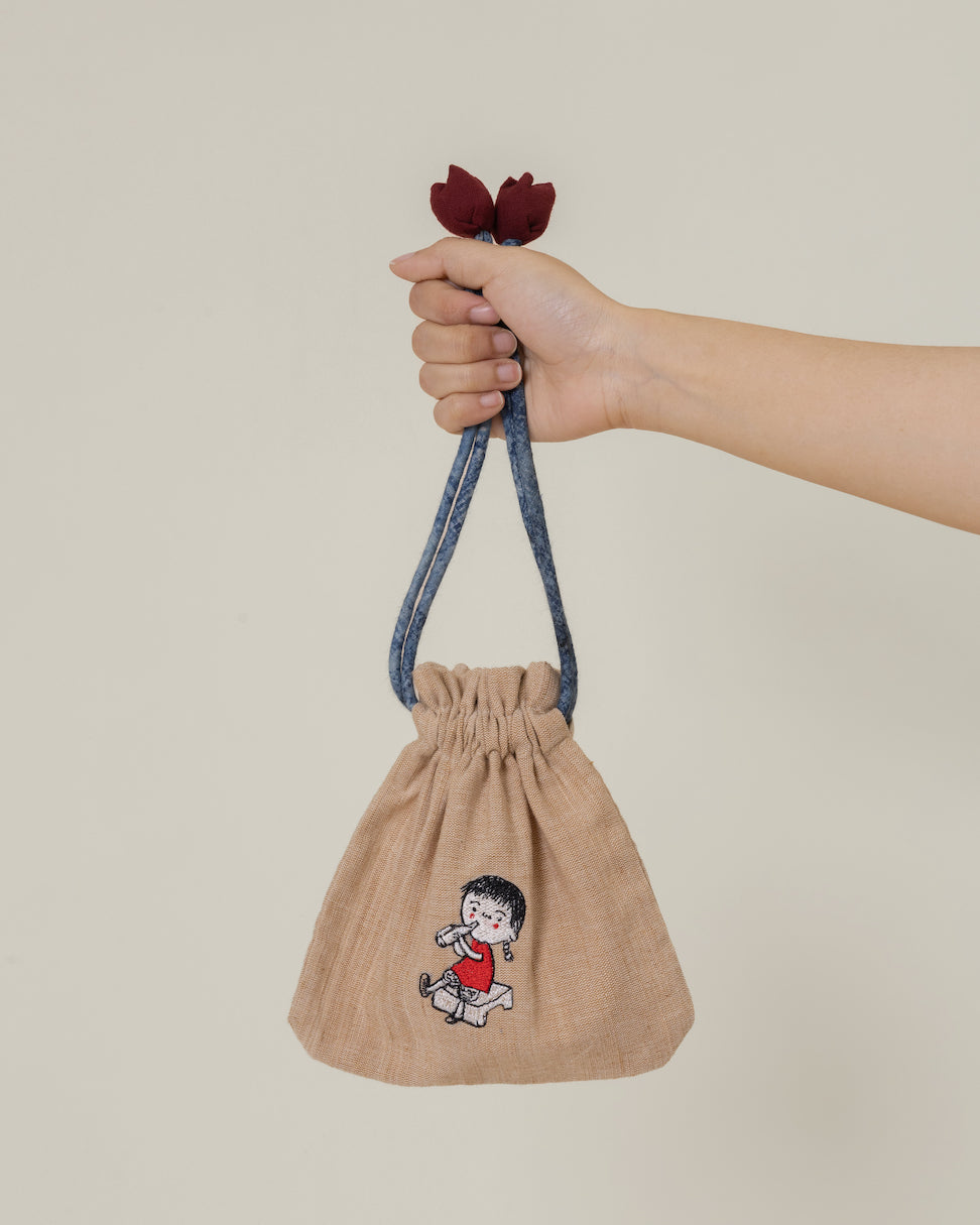 Gathered at the top with our signature hand-dyed cotton flower, made by hand in a natural red accent. Na Willa herself sits on the front, embroidered by our Ibus. Small, considered, unmistakably hers.