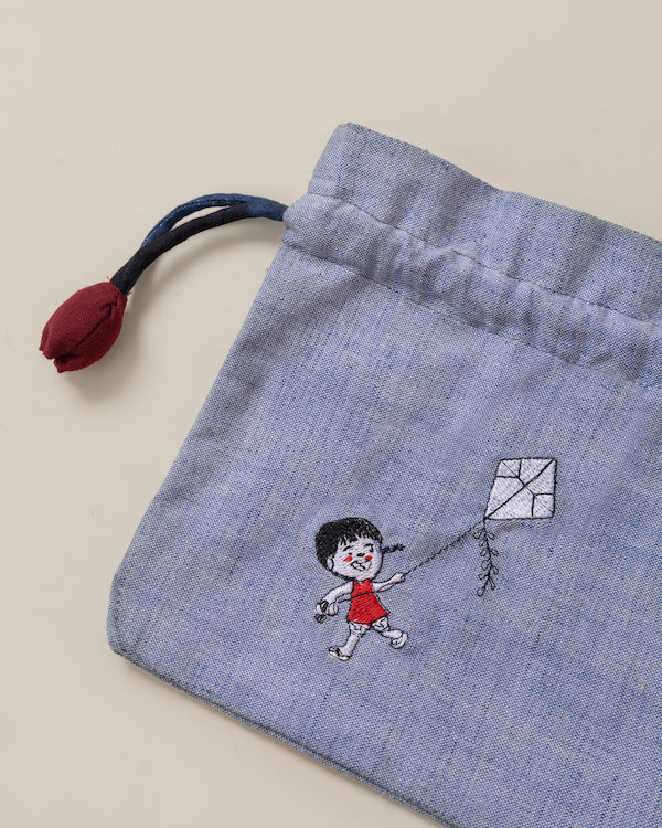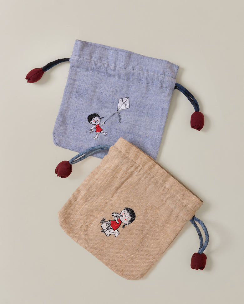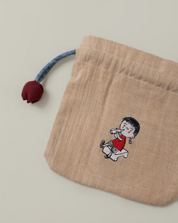 A roomy drawstring pouch in handwoven cotton. Structured enough to hold its shape, generous enough for your essentials, your cosmetics, and everything you grab on the way out the door.